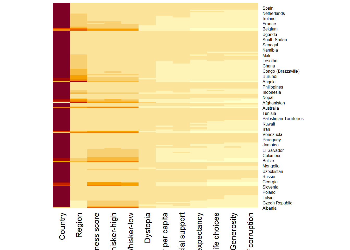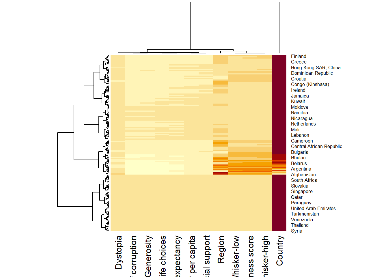 row.names(wh) <- wh$CountryTransforming the data frame into a matrix to be able to create heat maps